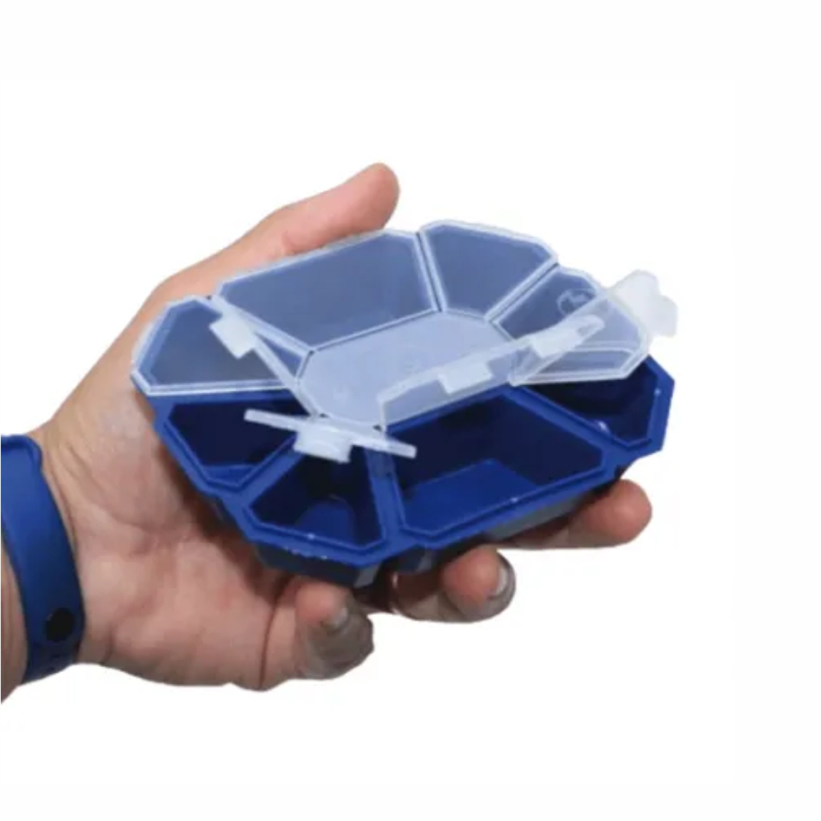 Estojo com 08 divisões fixas e tampa com fechamento individual para cada divisão