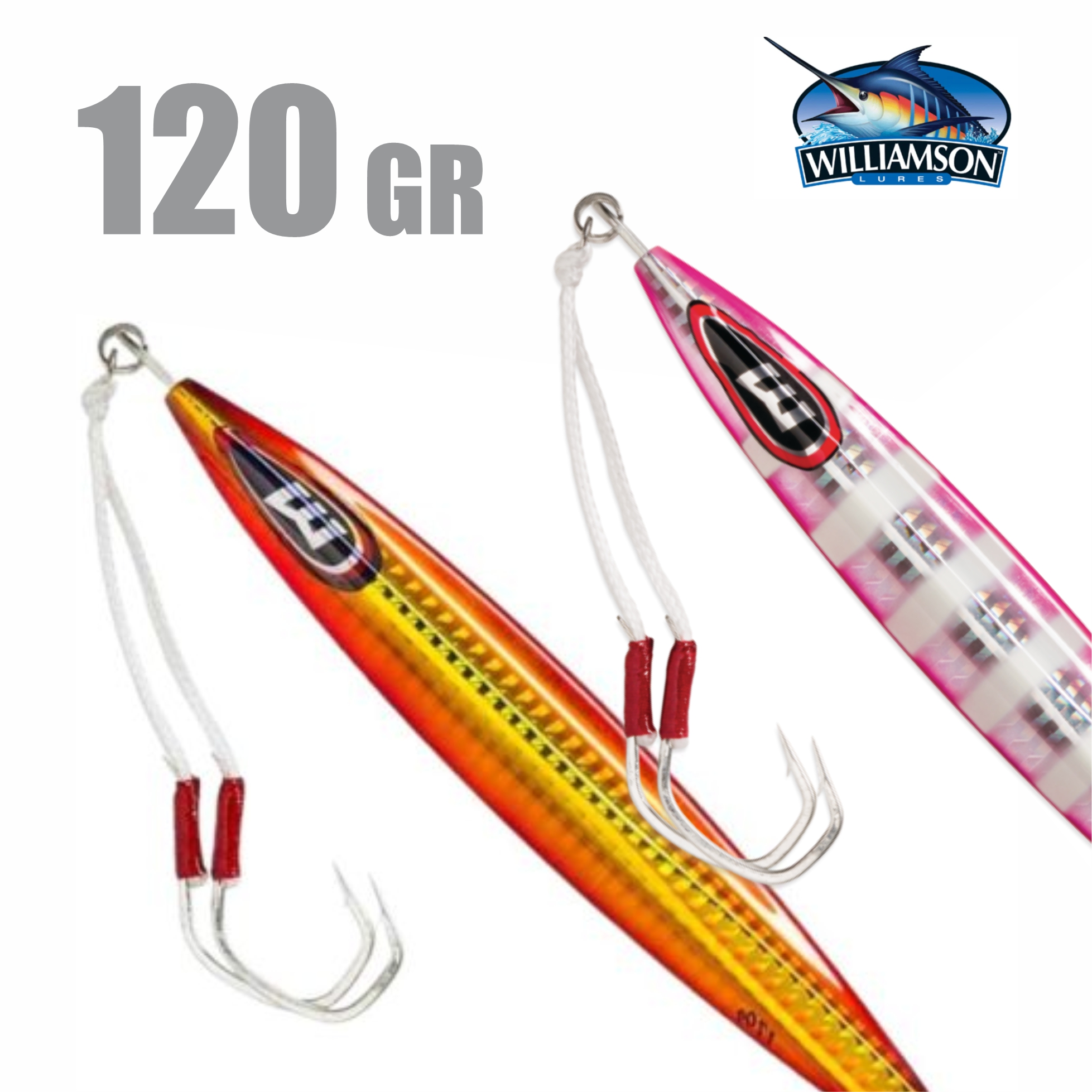Marca: Williamson Modelo: Kensaki Dimensões: (CxL): 13,3cm x 2cm Peso Aprox.: 120g Suporte Hook Duplo Incluso. Tipo: Slow pitch e Vertical jig Composição: Chumbo