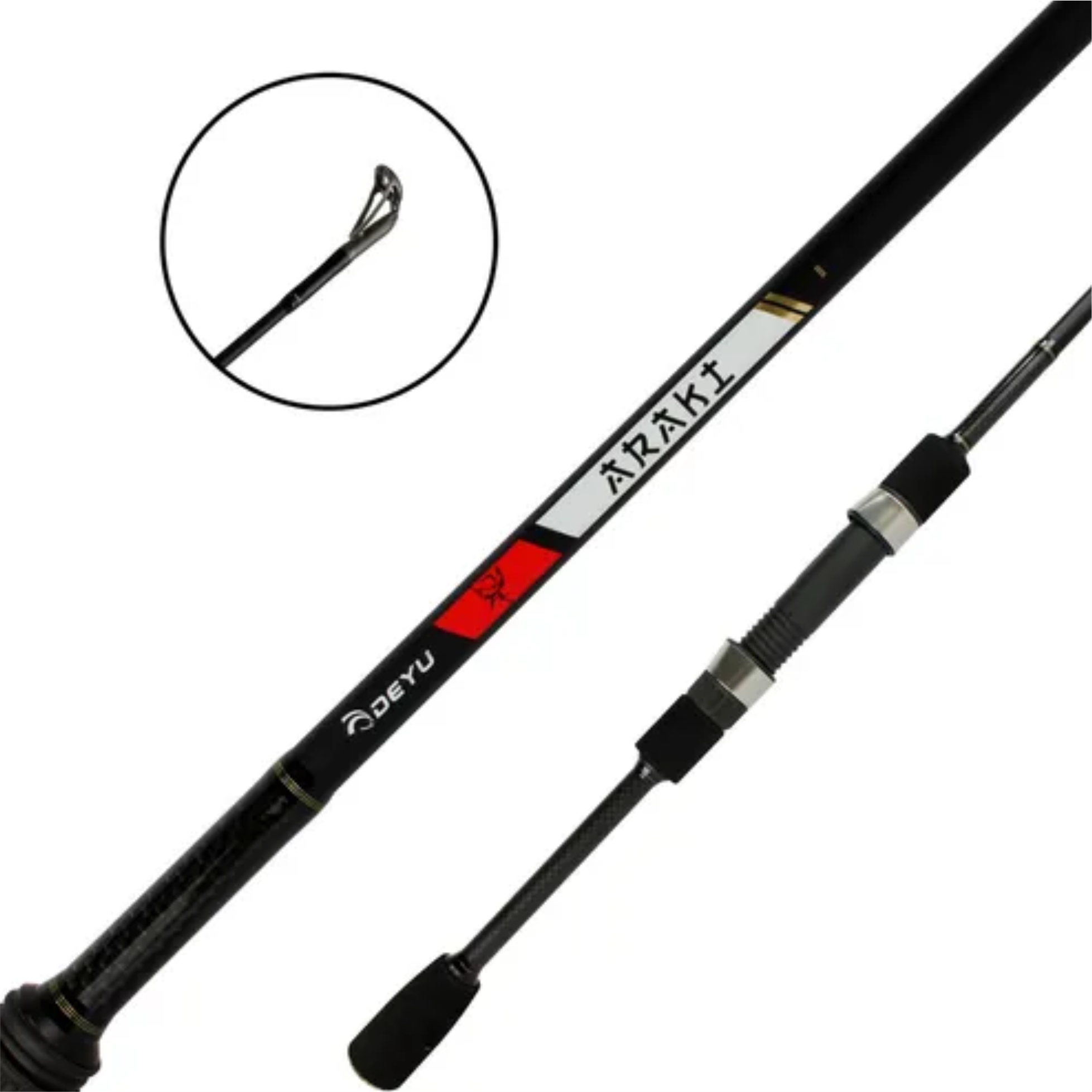 As novas varas Araki da Deyu são ideais para a pesca de robalos, galos, pequenos tucunarés e traíras. Especificações: - Marca: Deyu - Modelo: Araki (A-SCT651L-BK) - Tipo: Molinete - Ação: Rápida - Potência: Leve (L) - Partes: 1 (Inteiriça) - Comprimento: 6'5" - 1,9 m - Libragem: 07-14 lb - Passadores: Fuji - Blank: Carbono IM8 Garantia de fábrica: 7 dias